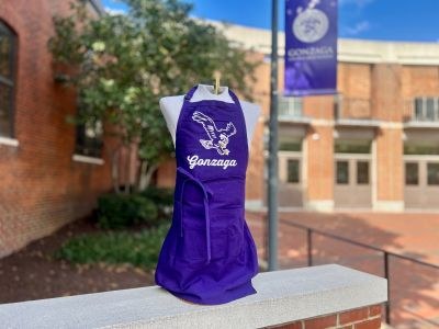 Purple apron with screaming eagle on front and the words GONZAGA in white. Front has two pockets to carry everything a cook would need, especially the one who barbeques.